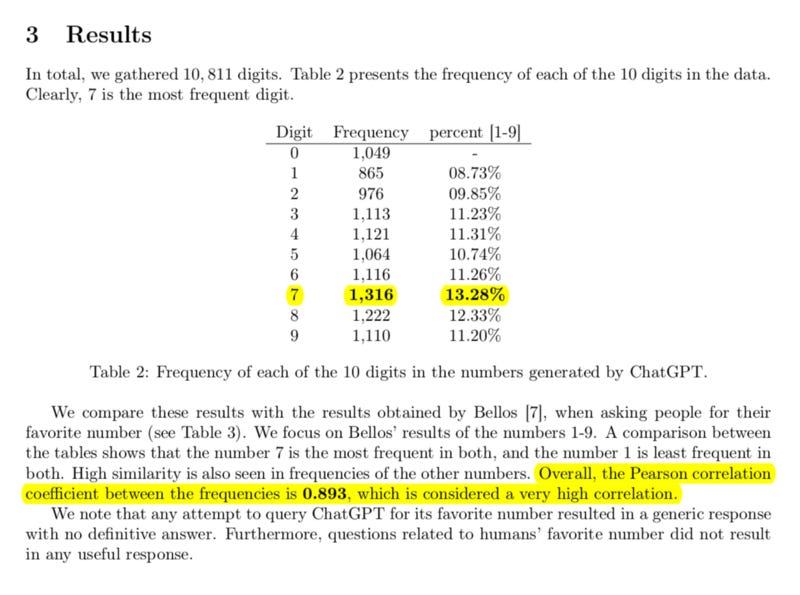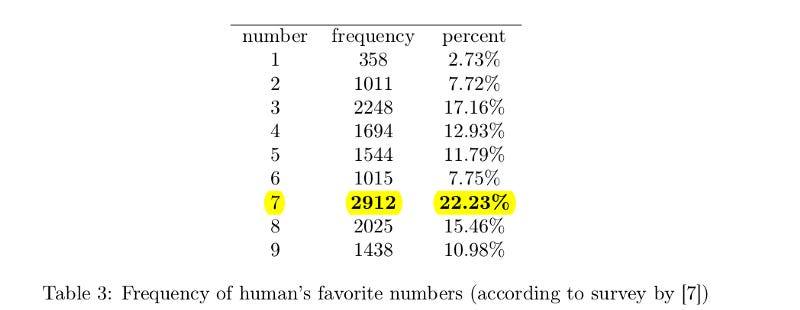 Chat GPT biases are also demonstrated in this study, when asked what is its favorite number 10,811 times. Seven comes up as the most common answer, same as us humans.