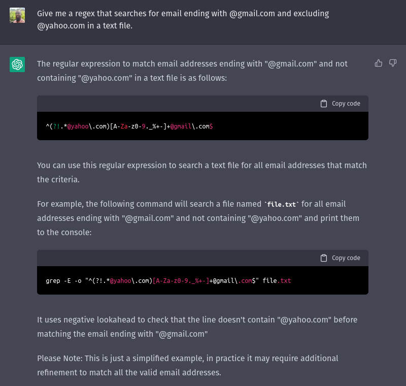 Like when I asked it for a regex to search for Gmail addresses and excluding Yahoo addresses in a text file. Really cool!